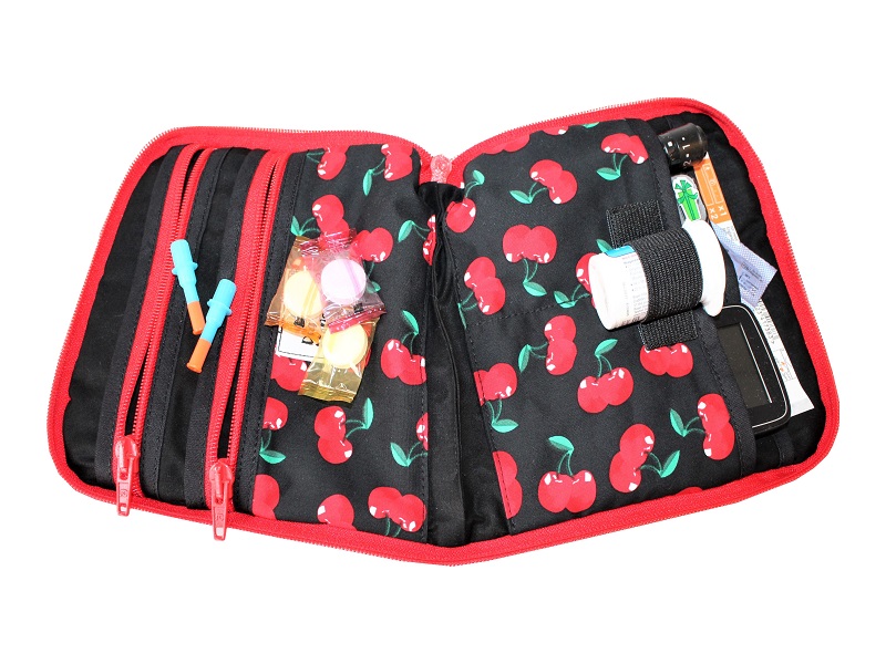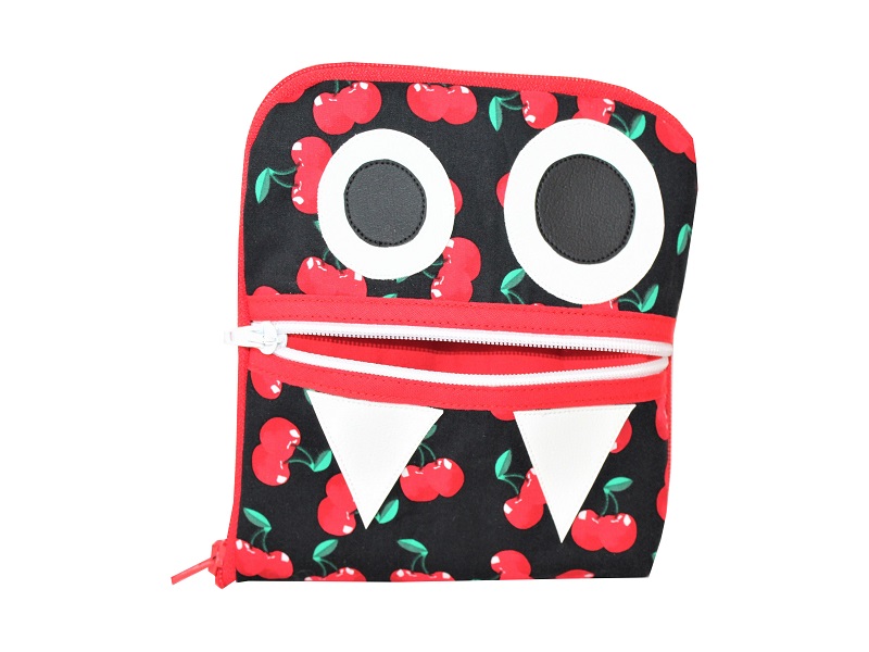 Ein schwarzer Baumwollstoff mit roten Kirschen wurde als Grundlage genutzt, auf der Oberfläche wurden Augen und Zähne appliziert, die gemeinsam mit dem eingenähten Reißverschluss ein Monstergesicht darstellen. Im Inneren der Tasche wurde der schwarze Baumwollstoff mit den Kirschen in Kombination noch einmal vernäht.