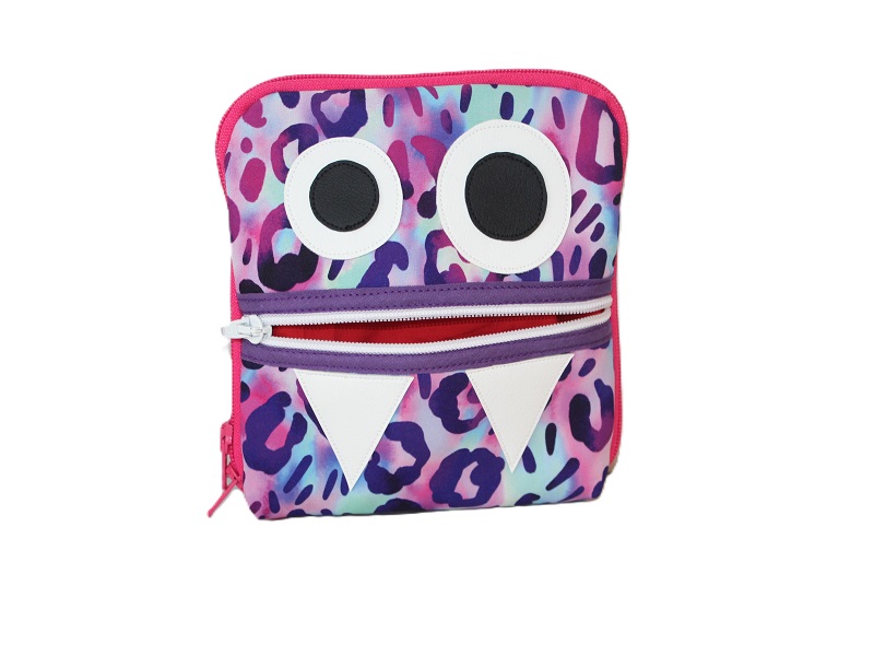 Ein robuster Softshellstoff (bekannt von Outdoorkleidung) mit Leomuster wurde als Grundlage genutzt, auf der Oberfläche wurden Augen und Zähne appliziert die gemeinsam mit dem eingenähten Reißverschluss ein Monstergesicht darstellen. Im Inneren der Tasche wurden farblich passende Baumwollstoffe vernäht. Links befinden sich 3 Einsteckfächer für Messgerät, Notizen, Bz-Tagebuch und eine Stechhilfe. Darauf eine Gummischlaufe für die Messstreifenbox. Auf der anderen Seite 2 Fächer mit Reißverschluss. Auch der Mund auf der Vorderseite kann mit Traubenzucker und Kleinigkeiten bestückt werden.