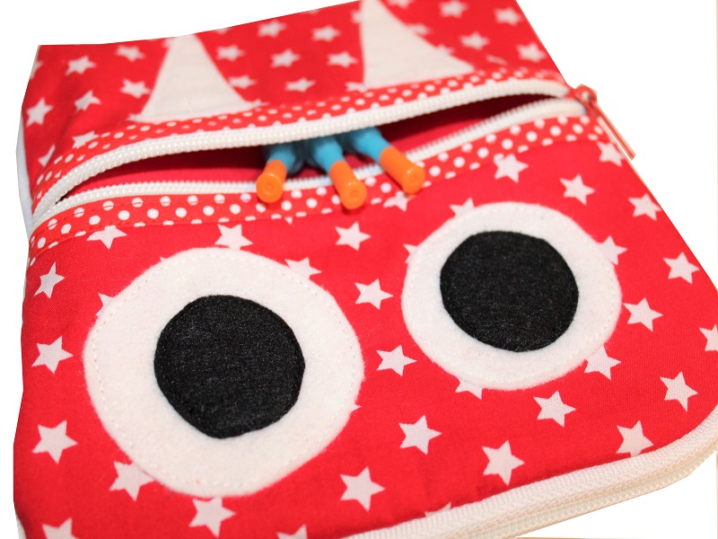 Ein roter Baumwollstoff mit weißen Sternen wurde als Grundlage genutzt, auf der Oberfläche wurden Augen und Zähne appliziert die gemeinsam mit dem eingenähten Reißverschluss ein Monstergesicht darstellen. Im Inneren der Tasche wurde ein passender roter Baumwollstoff mit Sternen vernäht.