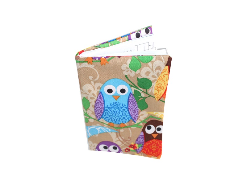 Genäht aus einem Baumwollstoff zum Schutz des Diabetes Tagebuches. Baumwolle in braun mit Eulenmotiv.