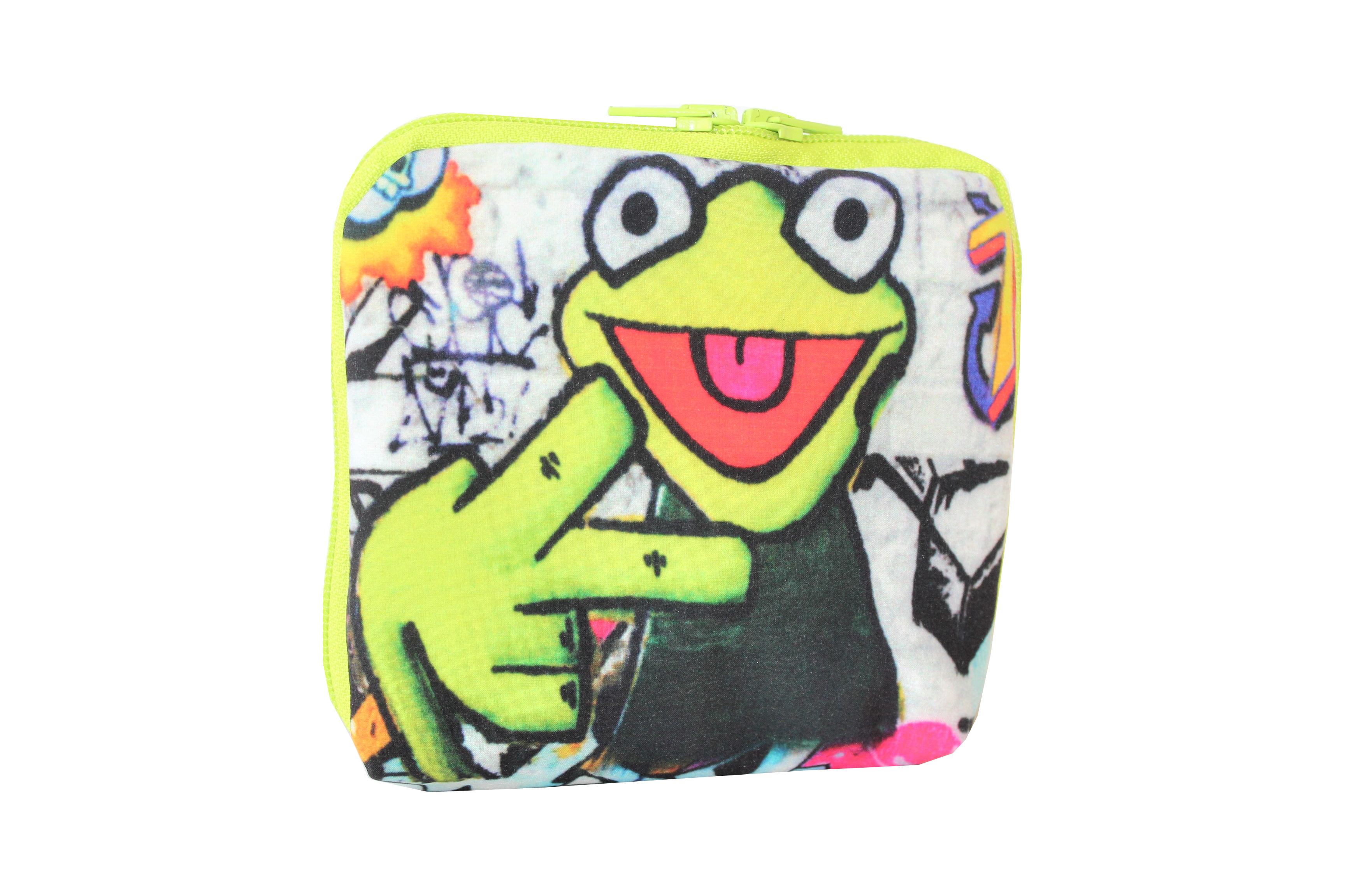 Gefertigt aus einem Softshellstoff mit dem Motiv Frosch und Graffiti. Das Innere ist eine farbliche Mischung aus grün und blau mit weißen Sternen.