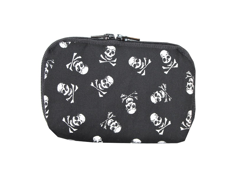 Gefertigt aus einem schwarzen Baumwollstoff mit weißen Skulls und einem Baumwollstoff in uni Schwarz. Zwischen beiden Stoffen befindet sich eine Lage Volumenvlies.