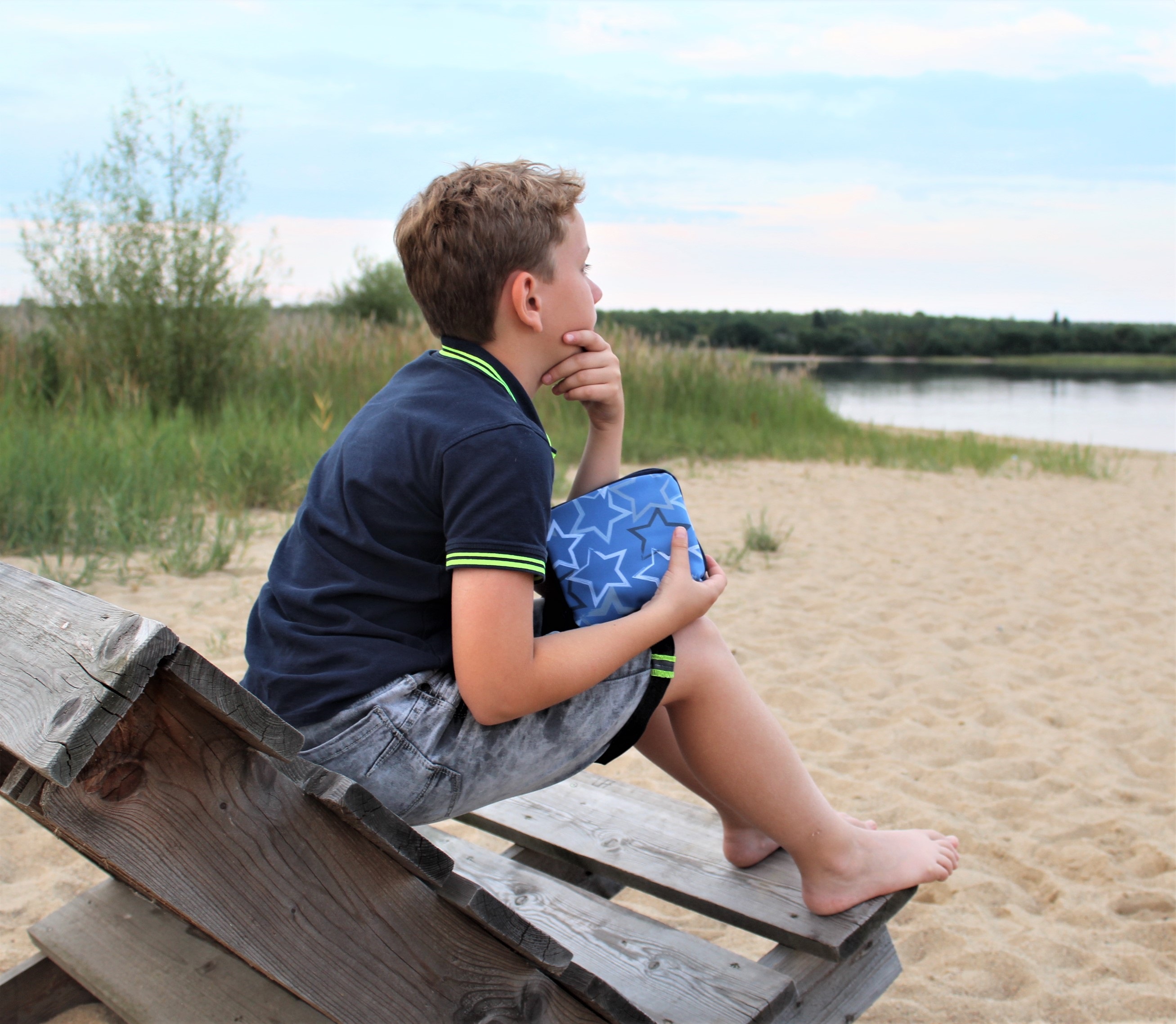 Gefertigt aus einem Softshellstoff mit verschieden farbigen Sternen. Das Innere ist eine Mischung aus blau und blau mit weißen Sternen, Schrägband in grau rundet das Design ab.