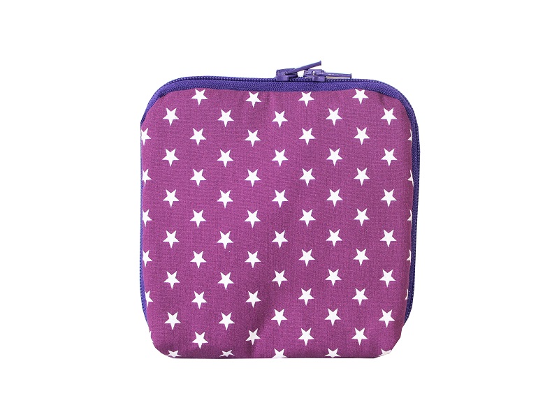 Gefertigt aus einem Baumwollstoff mit weißen Sternen. Das Innere ist eine Mischung aus uni lila und einem Stoff in lila mit bunten Sternen, Schrägband in türkis und ein Reißverschluss in gelb runden das Design ab.