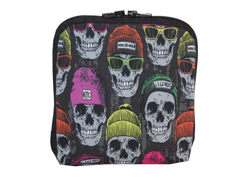 Gefertigt aus einem robusten, schwarzen Softshellstoff mit bunten Skulls. Das Innere ist aus einem unifarbenen, schwarzen Baumwollstoff gefertigt. Der Reißverschluss an der Tasche außen ist schwarz.