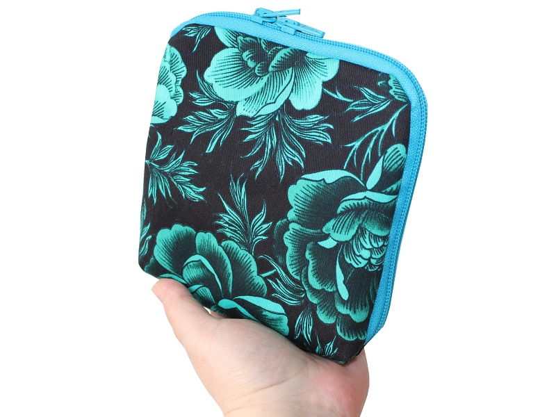 Gefertigt aus einem schwarzen Baumwollstoff mit einer großen türkisen Blume. Das Innere ist aus einem Baumwollstoff gefertigt, eine Mischung aus uni schwarz und die Reißverschlüsse in türkis.