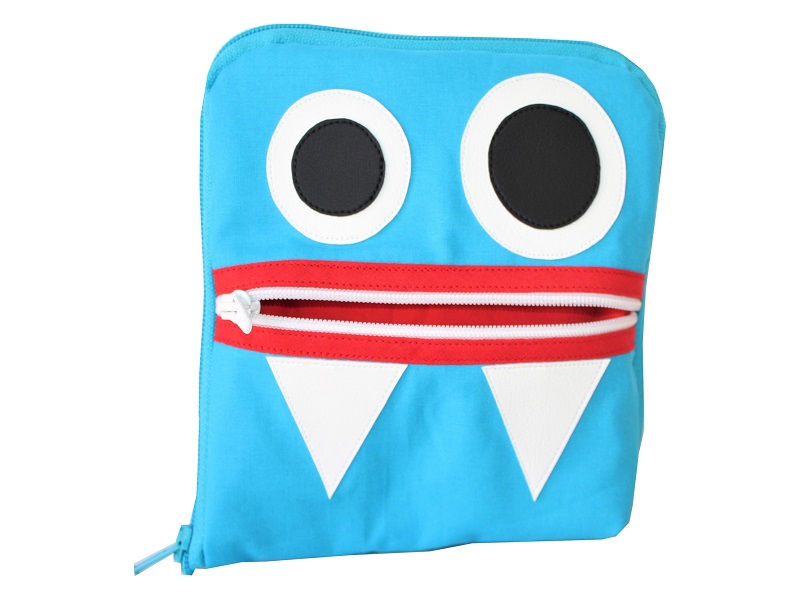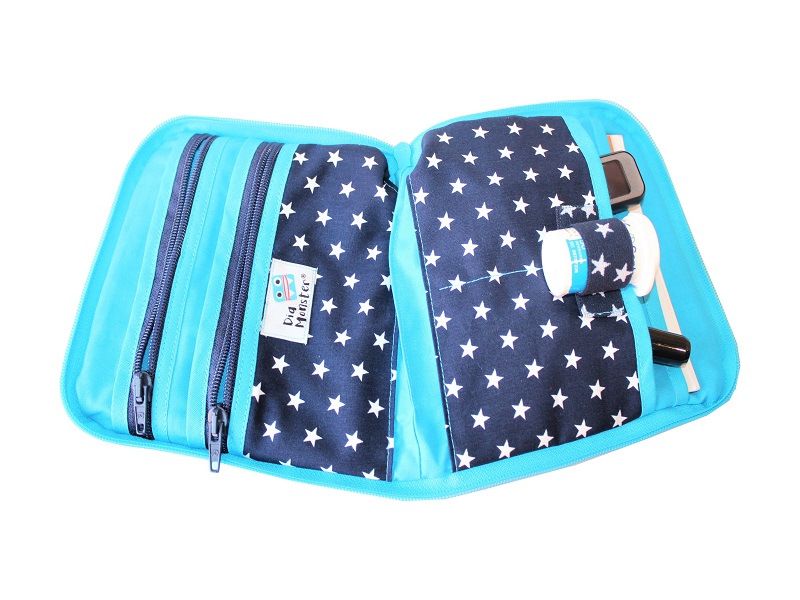 Ein türkisblauer Baumwollstoff wurde als Grundlage genutzt, auf der Oberfläche wurden Augen und Zähne appliziert, die gemeinsam mit dem eingenähten Reißverschluss ein Monstergesicht darstellen. Im Inneren der Tasche wurde der unifarbene türkisblaue Baumwollstoff mit einem Sternenstoff gemixt. Eine Schlaufe für die Teststreifenbox ist inklusive. Die Tasche verfügt über 2 Fächer mit Reißverschluss und 3 Einsteckfächer.