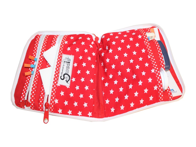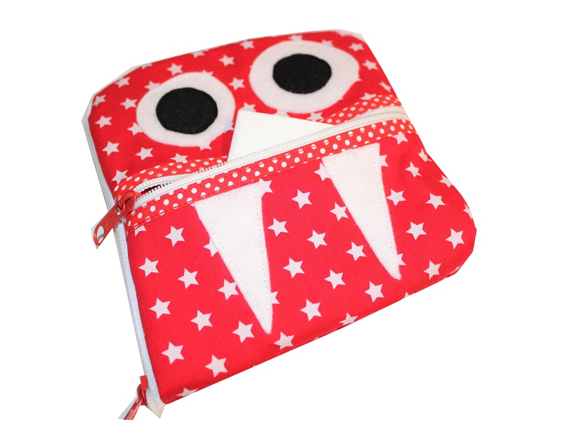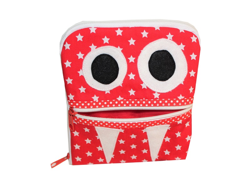 Ein roter Baumwollstoff mit weißen Sternen wurde als Grundlage genutzt, auf der Oberfläche wurden Augen und Zähne appliziert die gemeinsam mit dem eingenähten Reißverschluss ein Monstergesicht darstellen. Im Inneren der Tasche wurde ein passender roter Baumwollstoff mit Sternen vernäht.