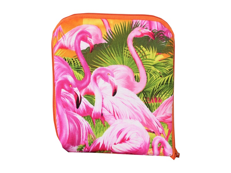 Ein amerikanischer Patchworkstoff mit einem Flamingomotiv ziert die Oberfläche der Tasche und macht sie zu einem Eyecatcher. Im Inneren der Tasche wurde ein passender unifarbener Baumwollstoff vernäht. Auch ein pinkfarbenes Schrägband kommt zum Einsatz und der Reißverschluss in Orange wurde farblich auf die Tasche abgestimmt.