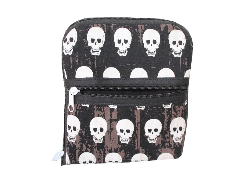 Ein amerikanischer Patchworkstoff in Schwarz mit weißen Skulls ziert die Oberfläche der Tasche und macht sie zu einem Eyecatcher. Im Inneren der Tasche wurde ein passender unifarbener Baumwollstoff vernäht. Ein Schrägband in Schwarz kommt zum Einsatz und der Reißverschluss in Schwarz wurde farblich auf die Tasche abgestimmt.