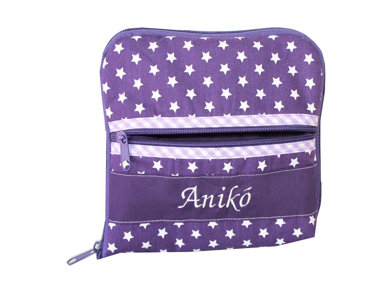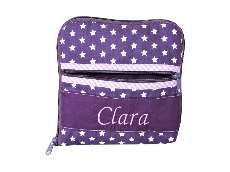 Baumwollstoff in Lila mit weißen Sternen wurde zu einer Diabetes Tasche verarbeitet. Das Innere wurde ganz in der Farbe Lila gehalten, das Schrägband ist Lila kariert. Gern nähen wir Ihnen, Ihre persönliche Wunschtasche.