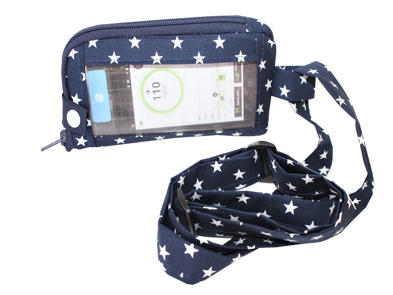 Blaue Tasche passgenau für das DBLG1-Handset angefertigt mit Sichtfenster. Ein Baumwollstoff in blau mit kleinen weißen Sternen sorgt nicht nur für eine schöne Verpackung des Gerätes, sondern auch für ein stets griffbereites und immer gut verstautes Diabetesmanagement. Geschlossen wird die Tasche mit einem Reißverschluss. Oben an der Tasche befindet sich eine Schlaufe, durch die ein Band gezogen wird. Dieses Band ist 2,5cm breit, wird genäht aus dem selben Stoff und befindet sich im Lieferumfang. Die spezielle Folie ist touchfähig, das Gerät muss nicht aus der Tasche entnommen werden.