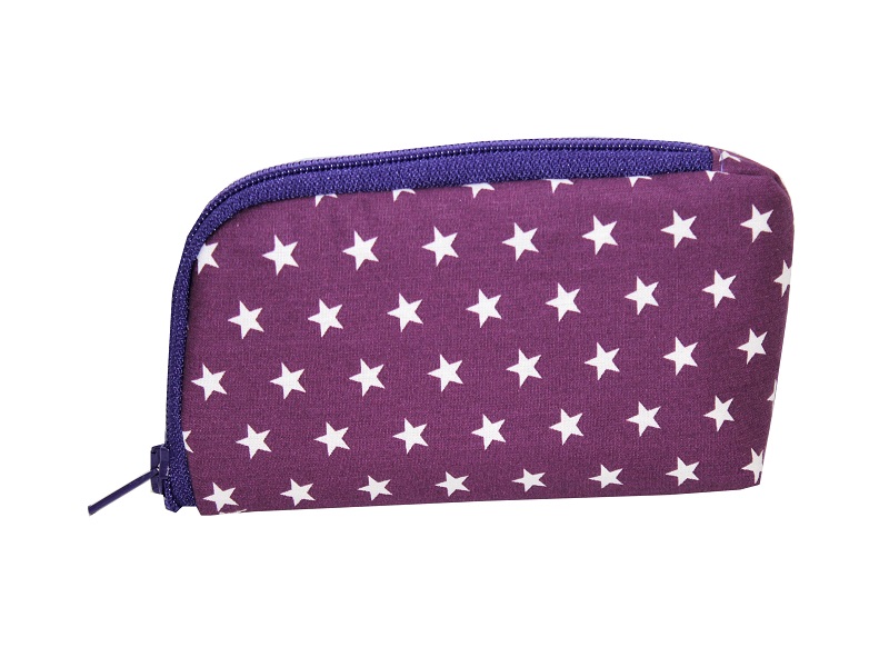 Lila Tasche passgenau für das DBLG1-Handset angefertigt. Ein Baumwollstoff in lila mit kleinen weißen Sternen sorgt nicht nur für eine schöne Verpackung des Gerätes, sondern auch für ein stets griffbereites und immer gut verstautes Diabetesmanagement. Geschlossen wird die Tasche mit einem Reißverschluss. Auf der Rückseite befindet sich eine Schlaufe für einen Gürtel und eine Schlaufe mit einem Karabiner. Zwischen den beiden Lagen Baumwolle, befindet sich noch ein Volumenvlies für die Stabilität der Tasche.