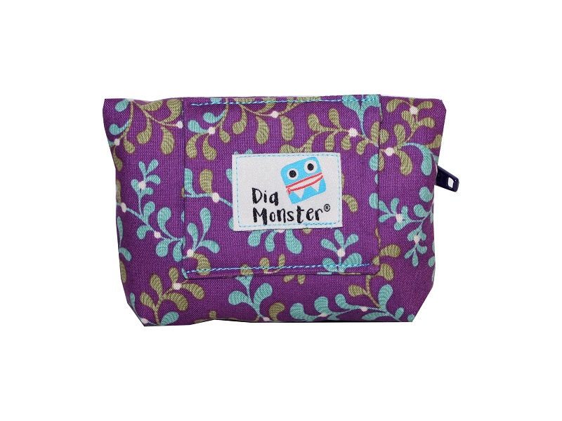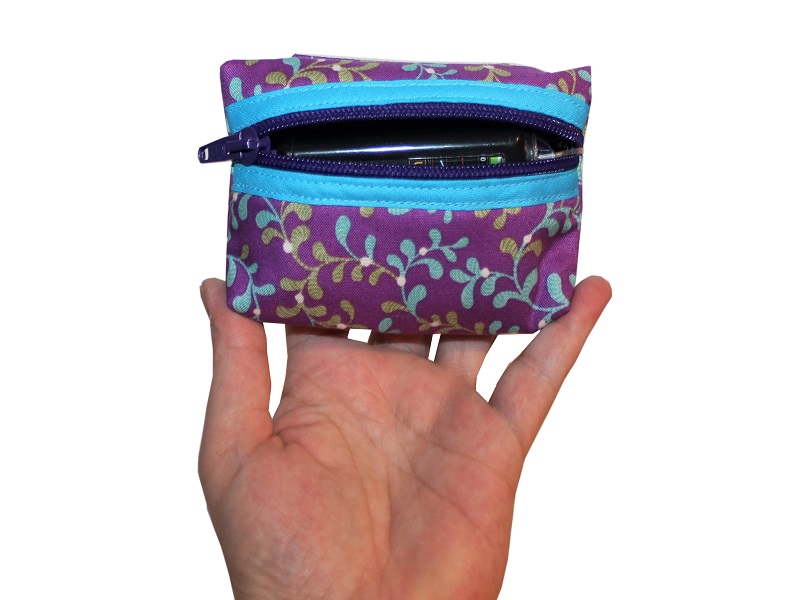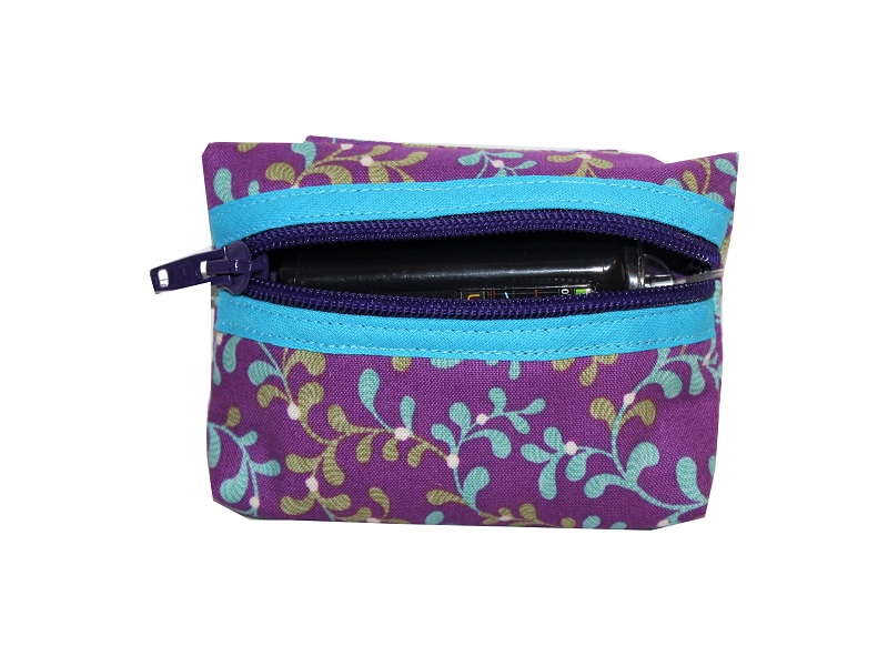 Die Pumpentasche wird aus einem lila Baumwollstoff mit Rankenmuster genäht, innen mit einem Volumenvlies abgefüttert. Hinten an der Pumpentasche befindet sich eine Schlaufe für die Befestigung am Gürtel. Die Pumpentasche wird mit einem waagerechten Reißverschluss geschlossen um die Pumpe vor dem Herausfallen zu schützen. Der Austritt für den Katheter befindet sich seitlich.