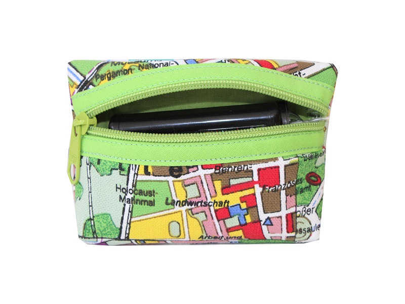 Die Pumpentasche wird aus Baumwollstoffen genäht, innen mit einem Volumenvlies abgefüttert. Hinten an der Pumpentasche befindet sich eine Schlaufe für die Befestigung am Gürtel. Mit einem waagerechten Reißverschluss wird die Tasche sicher geschlossen. Der Austritt für den Katheter wird an die Pumpe angepasst. Der Katheter kann bei diesen Taschen ungehindert seitlich am Reißverschluss heraus geführt werden.