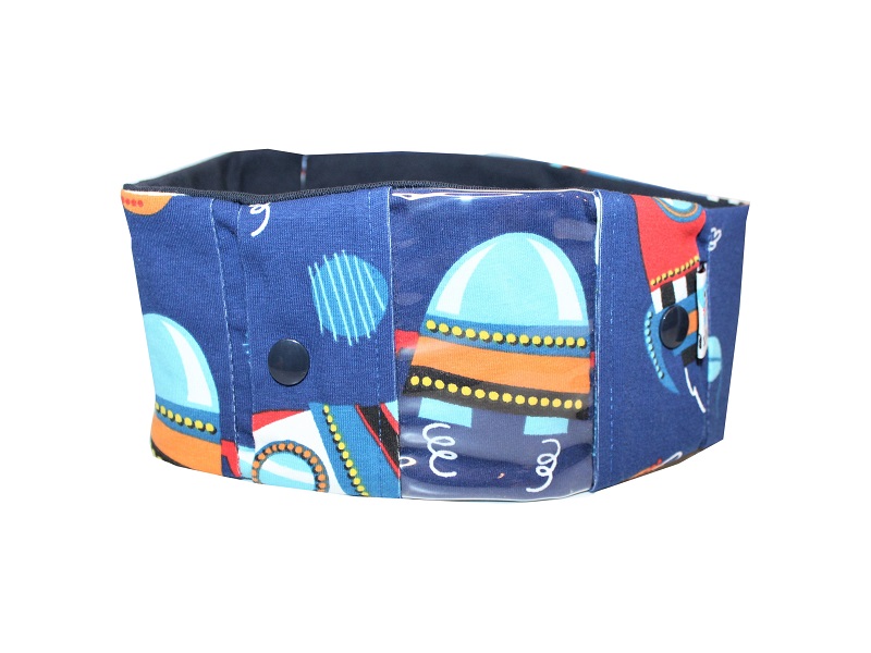 Das Band ist sehr angenehm zu tragen, tags wie nachts, Sommer wie Winter immer ein schönes Accessoire. Der Clou, ist das eingenähte Sichtfenster, beidseitig kann die Pumpe eingesteckt werden und steht so nicht auf dem Kopf. Auch bei einem kurzen Katheter ein großer Vorteil. Die Pumpe muss zur Bedienung nicht entnommen werden, durch die Folie hindurch ist die Pumpe bedienbar. Da es sich um eine waschbare Folie handelt, kann das Sportband bei 30° gewaschen werden, bitte nicht in den Trockner geben und nicht Schleudern. Die Rückseite des Bandes ist uni navyblau.