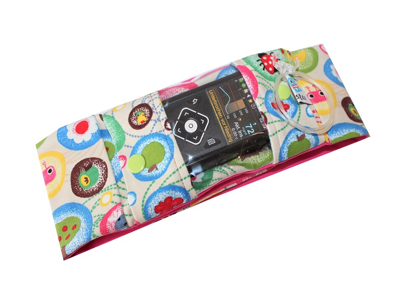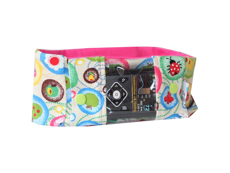 Das Band ist sehr angenehm zu tragen, tags wie nachts, Sommer wie Winter immer ein schönes Accessoire. Der Clou, ist das eingenähte Sichtfenster, beidseitig kann die Pumpe eingesteckt werden und steht so nicht auf dem Kopf. Auch bei einem kurzen Katheter ein großer Vorteil. Die Pumpe muss zur Bedienung nicht entnommen werden, durch die Folie hindurch ist die Pumpe bedienbar. Da es sich um eine waschbare Folie handelt, kann das Sportband bei 30° gewaschen werden, bitte nicht in den Trockner geben und nicht Schleudern. Die Rückseite des Bandes ist uni pink.