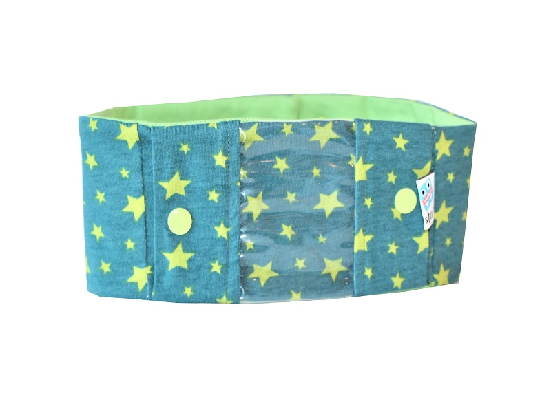 Das Band ist sehr angenehm zu tragen, tags wie nachts, Sommer wie Winter immer ein schönes Accessoire. Der Clou, ist das eingenähte Sichtfenster, beidseitig kann die Pumpe eingesteckt werden und steht so nicht auf dem Kopf. Auch bei einem kurzen Katheter ein großer Vorteil. Die Pumpe muss zur Bedienung nicht entnommen werden, durch die Folie hindurch ist die Pumpe bedienbar. Da es sich um eine waschbare Folie handelt, kann das Sportband bei 30° gewaschen werden, bitte nicht in den Trockner geben und nicht Schleudern. Die Rückseite des Bandes ist uni grün.