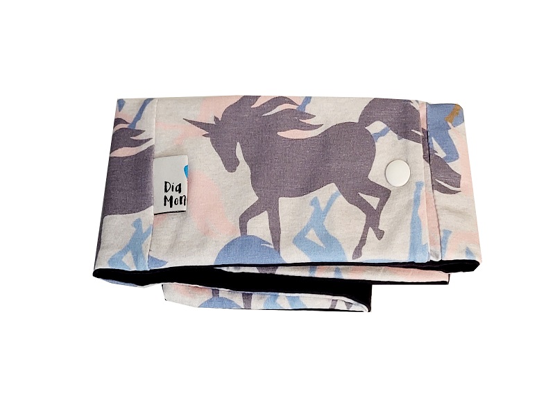 Es ist ca. 9cm hoch und verfügt über einen seitlichen Einschub der Pumpe. Einhörner auf einem hellen grau, Rückseite uni grau.