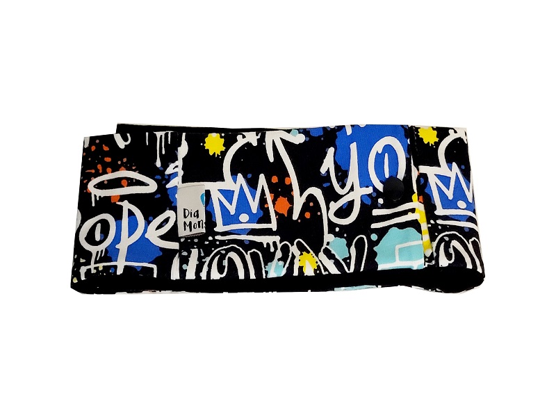 Es ist ca. 9cm hoch und verfügt über einen seitlichen Einschub der Pumpe. Wildes Graffiti auf schwarz, Rückseite uni schwarz.