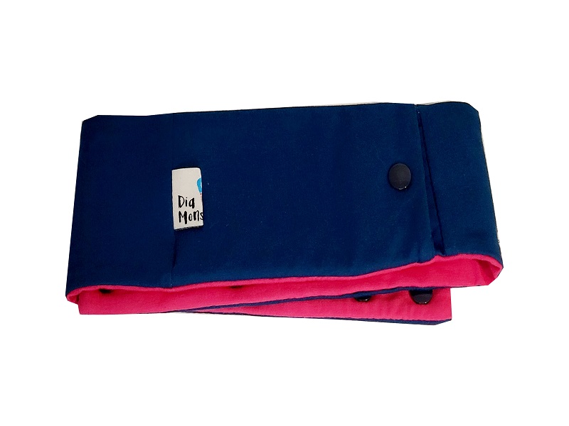 Es ist ca. 9cm hoch und verfügt über einen seitlichen Einschub der Pumpe. Farbe des Bandes petrol, Rückseite uni pink.
