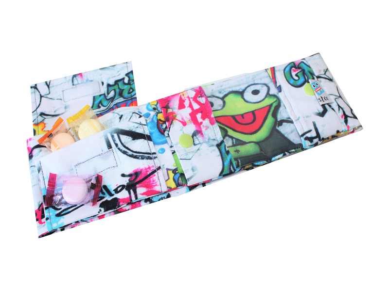 Es ist ca. 9cm hoch und verfügt über einen seitlichen Einschub der Pumpe. Am Band befindet sich noch eine aufgenähte Tasche mit Klettverschluss für ca. 3 Traubenzucker oder eine Tüte Gummibärchen.